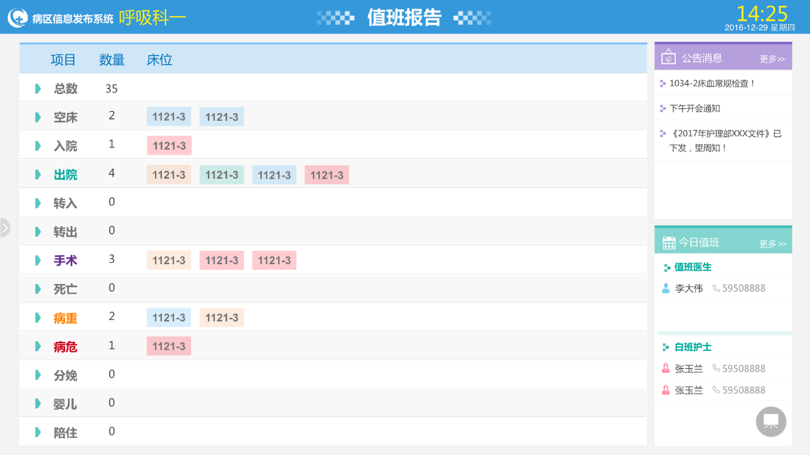 智能統(tǒng)計(jì)并展示,今日全員患者值班信息,快速了解病區(qū)情況,包括出入院情況、手術(shù)、病危等數(shù)據(jù)的自動(dòng)統(tǒng)計(jì)。