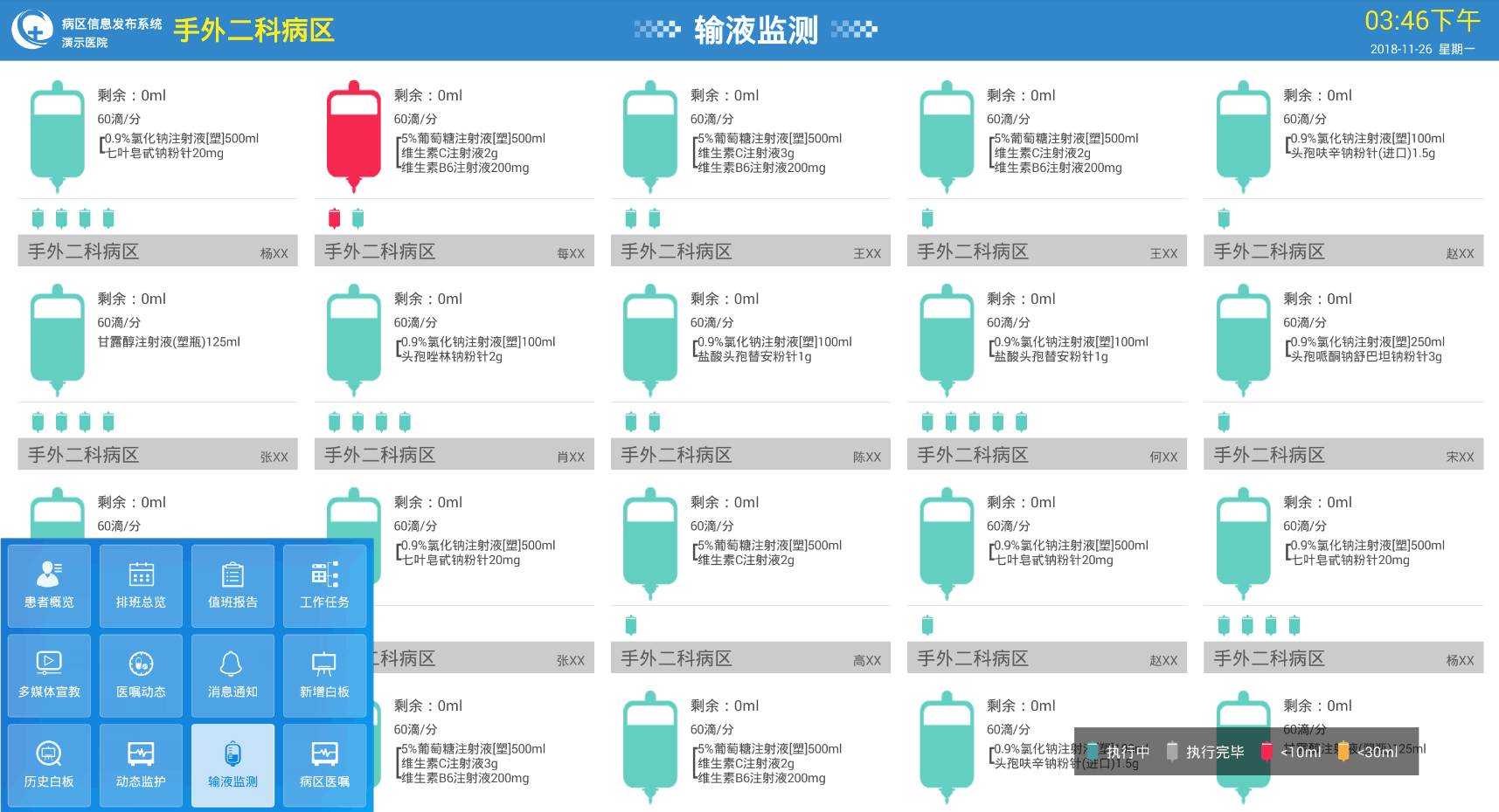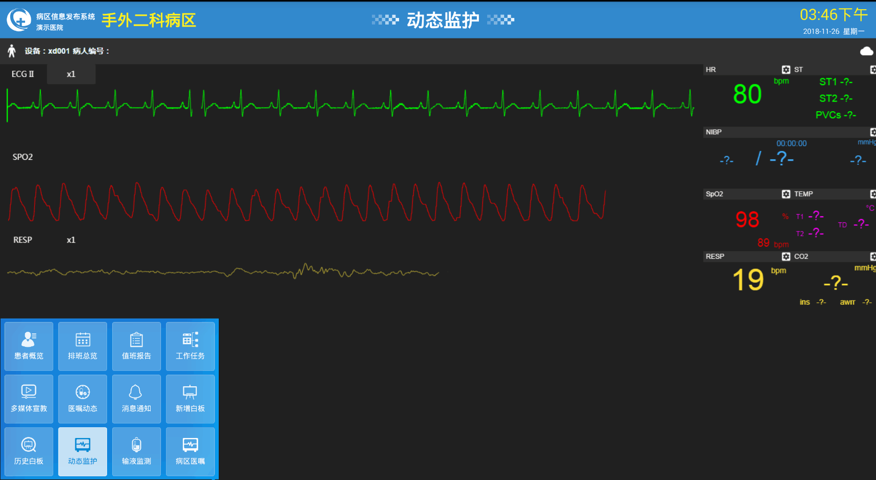 通過對接院內(nèi)物聯(lián)網(wǎng)設(shè)備動(dòng)態(tài)顯示監(jiān)護(hù)數(shù)據(jù),如心電監(jiān)護(hù)儀、輸液泵、輸液秤等。