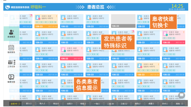 通過矩陣標(biāo)簽式患者視圖,概覽整個(gè)病區(qū)情況,并可以快速點(diǎn)選、交互查看不同類型患者信息,通過圖形化方式展現(xiàn)患者類型、出入院情況、基本信息、發(fā)燒情況、護(hù)理級別、病情危重程度等。